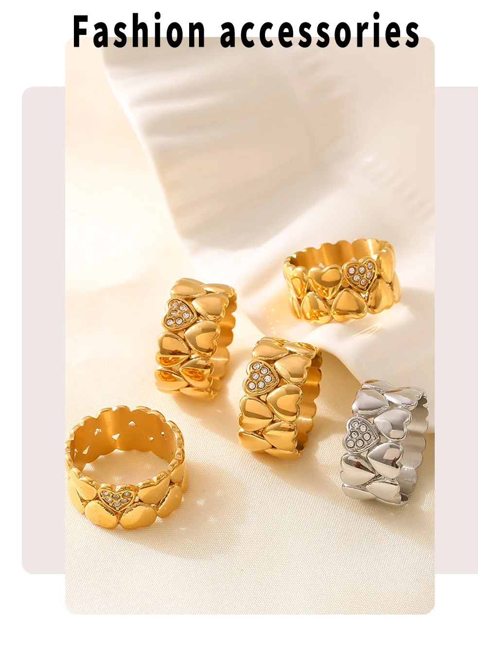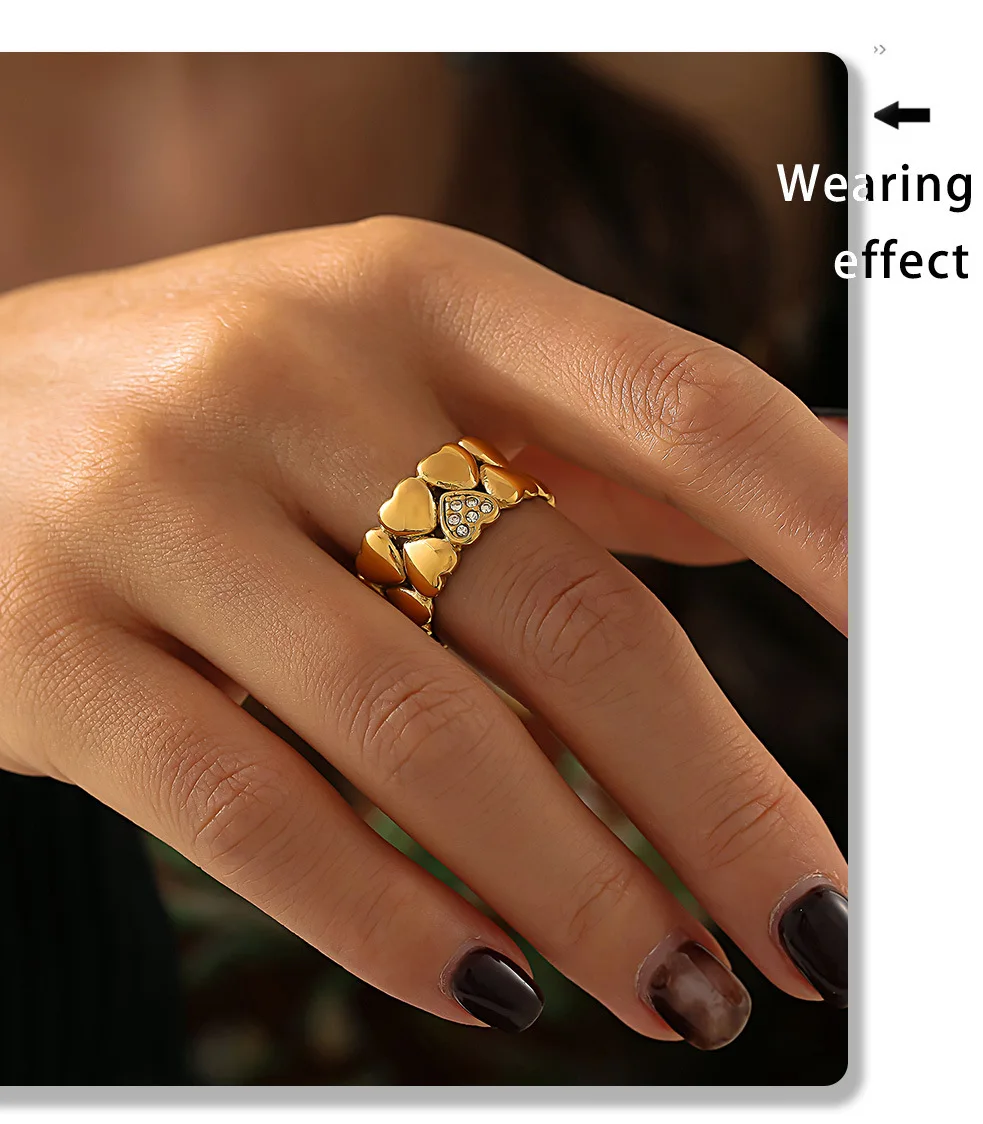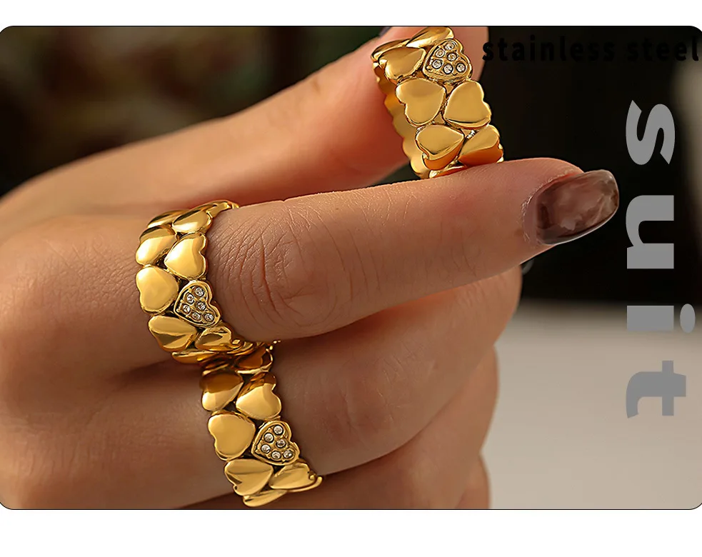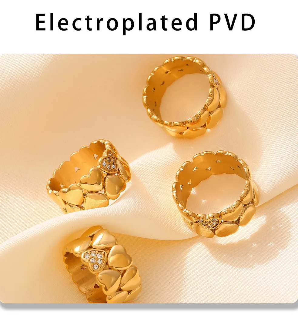 18K Gold-colored stainless steel heart ring for women, featuring a hollow design and double stackable style that won’t fade, perfect for weddings or bridal jewelry.