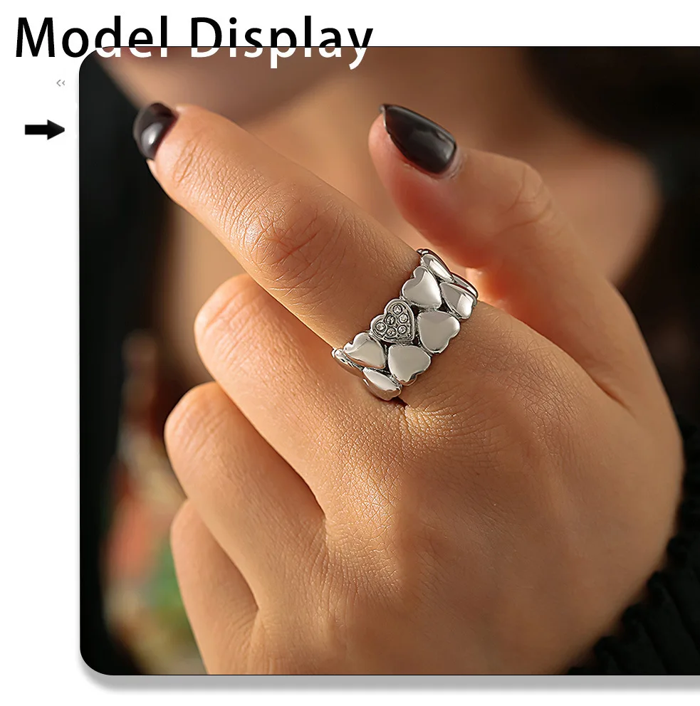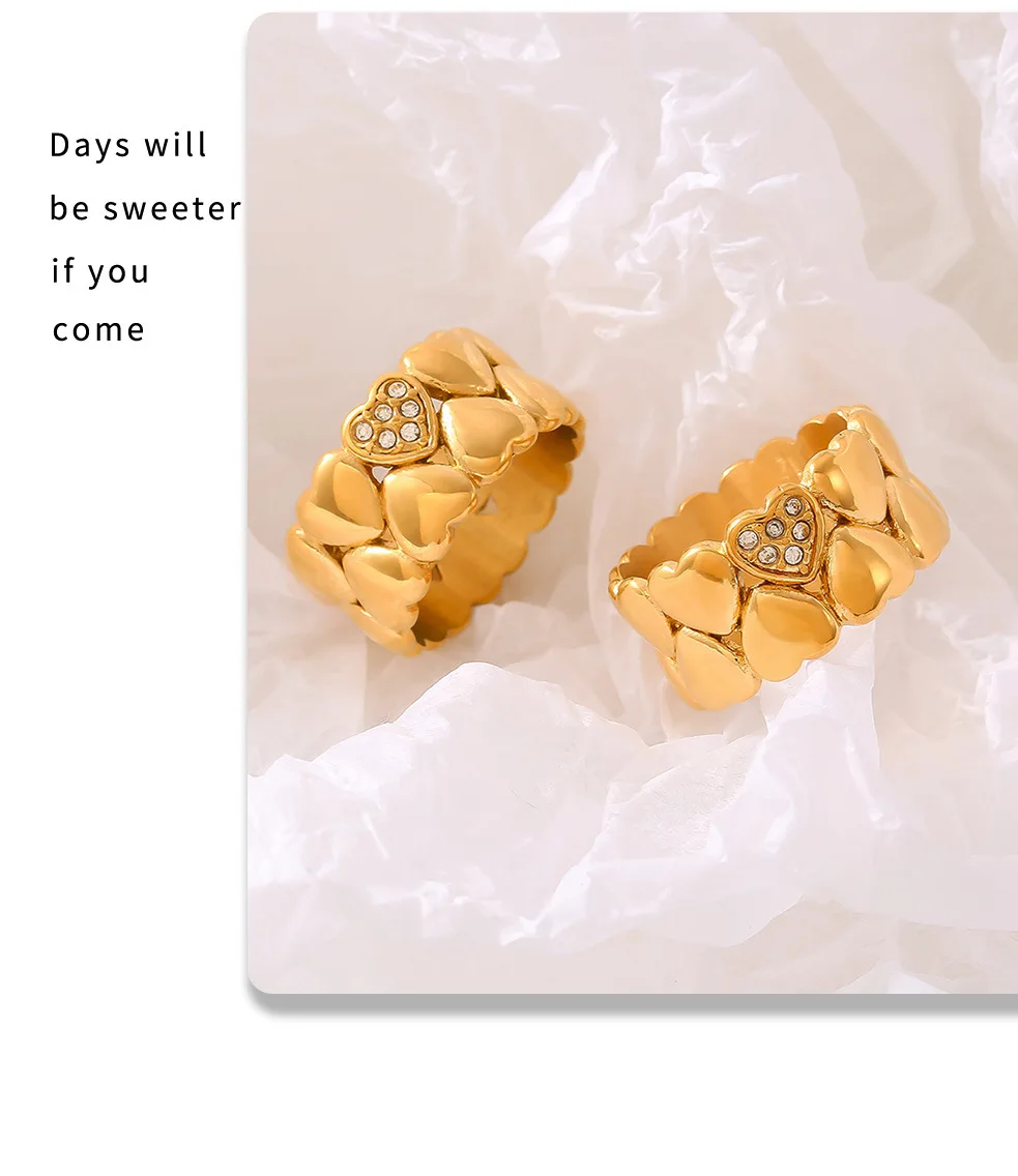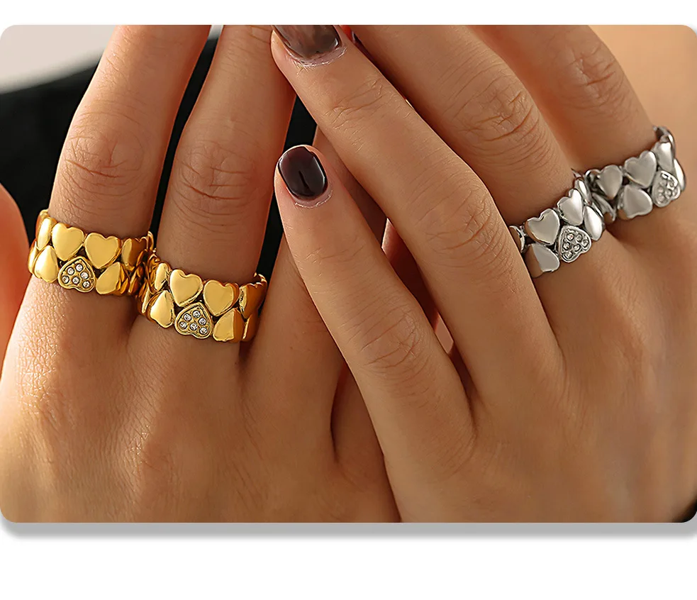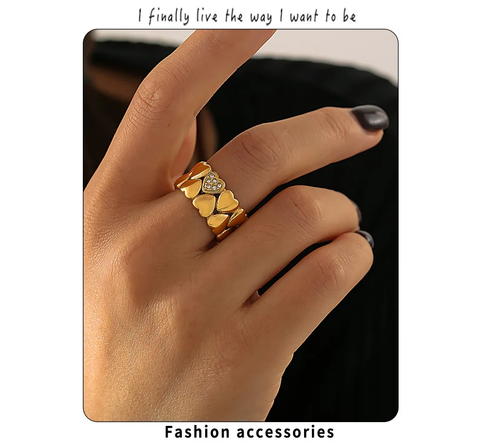 18K Gold-colored stainless steel heart ring for women, featuring a hollow design and double stackable style that won’t fade, perfect for weddings or bridal jewelry.