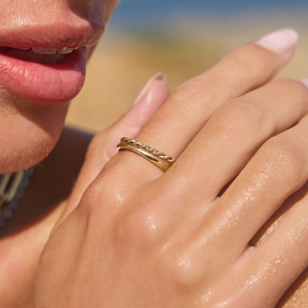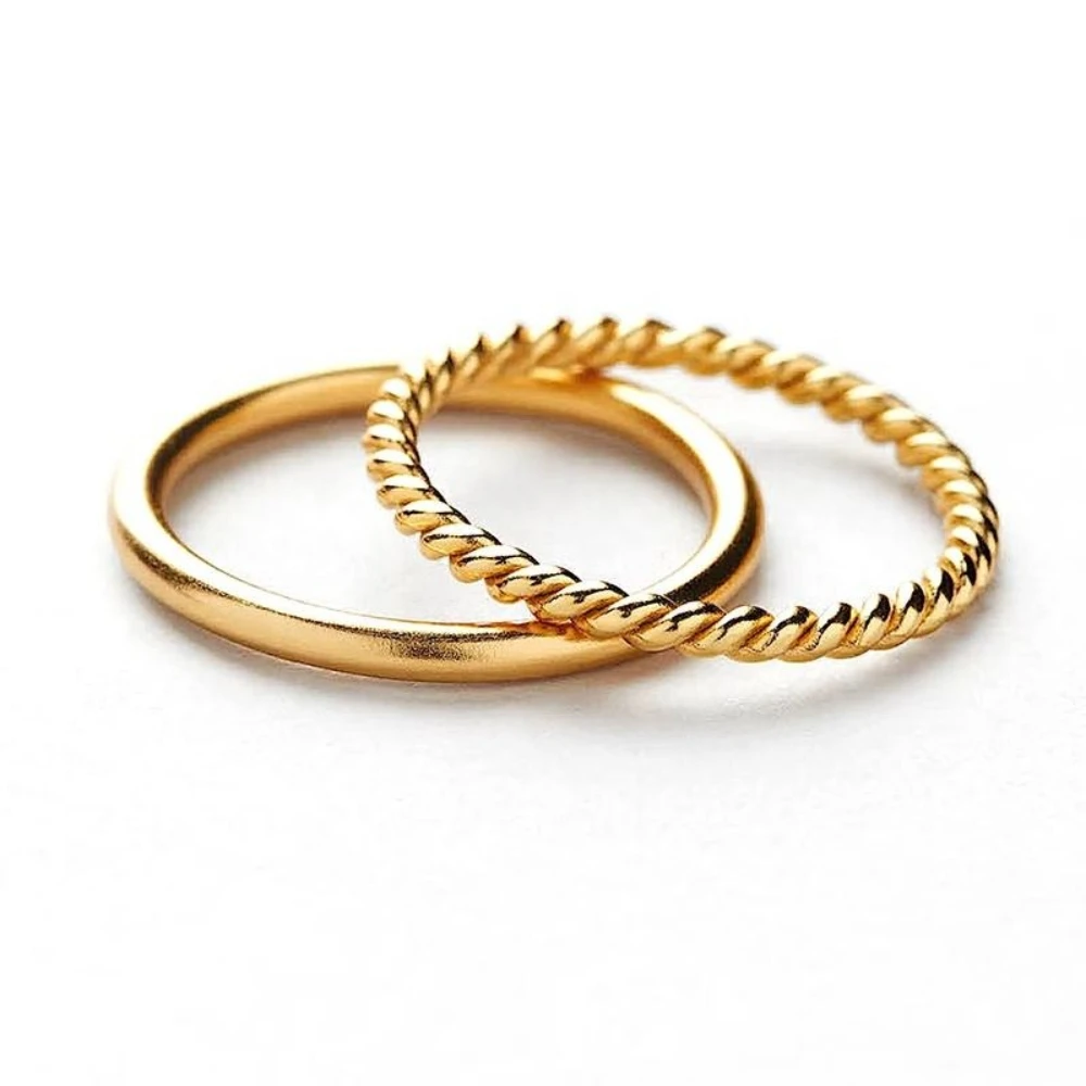 Non-tarnish classic stackable twist rope dome band rings in stainless steel, designed for women with a statement gold-plated minimalist style, make a perfect jewelry gift.